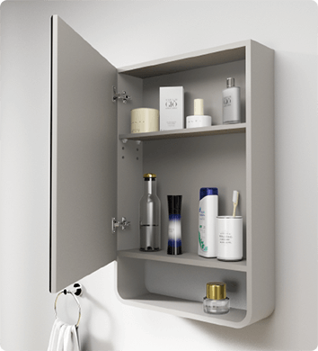 善用具收納功能的浴櫃與鏡櫃,將盥洗用具收納其中減少檯面物品,在視覺上產生空間擴大的效果。